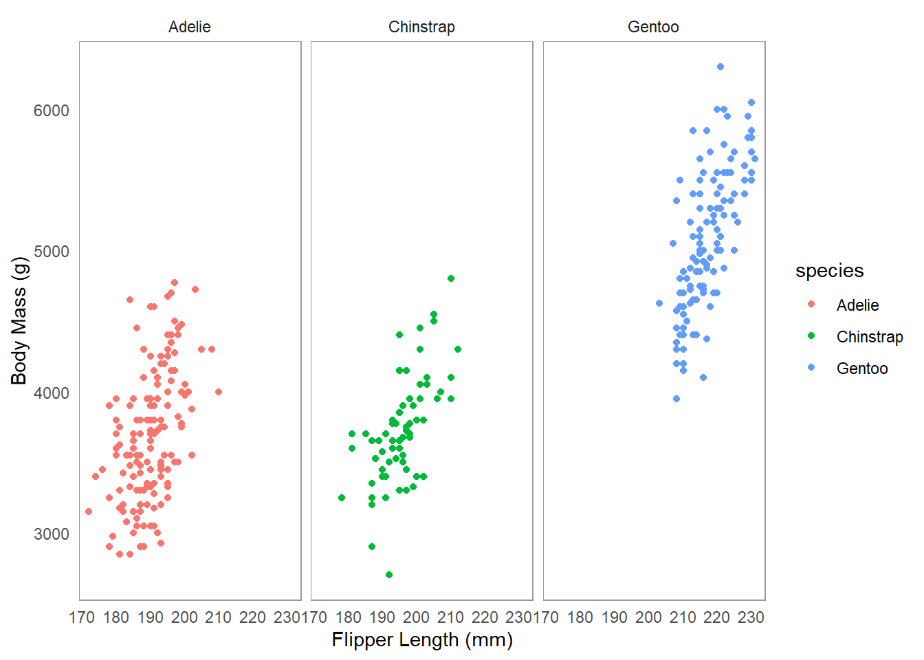 An example dataset palmerpenguins is available in the palmerpenguins package. Here is an example of how to use facet_wrap() with this dataset to create separate plots for each species of penguin.