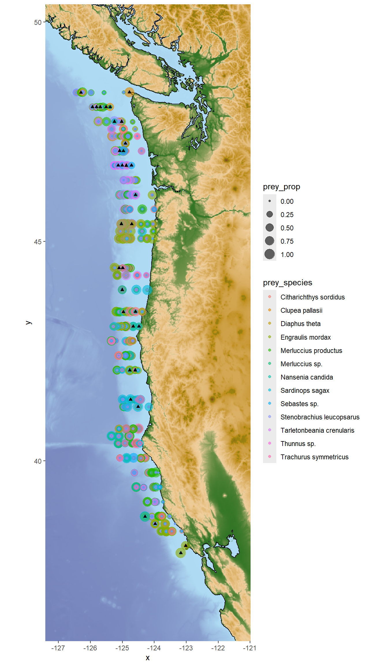 The makeup of the pie charts will change depending on which prey species you include in the `cols` argument of `geom_scatterpie()`.